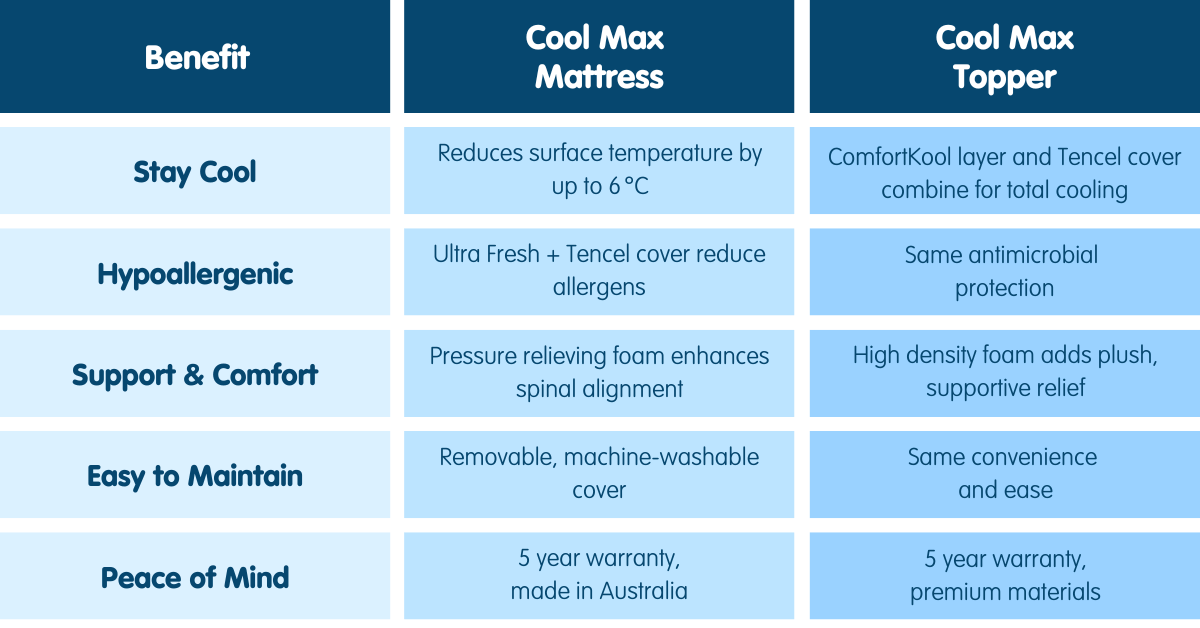 Ready to experience cooler, healthier sleep? Explore the full Comfort Platinum Cool Max mattress and topper range instore or online and choose the size that suits you best. Rest better, feel refreshed—every single night.