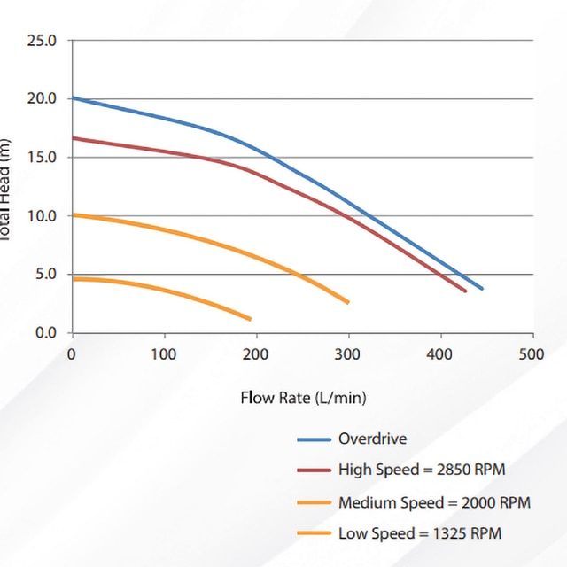 - Low Speed RPM / Flow Rate: 1325 RPM / 128LPM