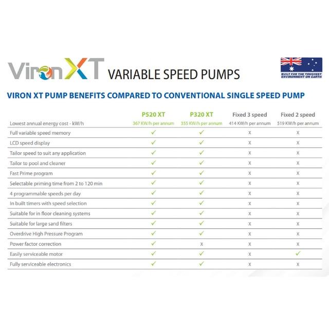 Warranty: For your peace of mind, Viron XT Pumps are covered by a limited 3 year warranty on motor and wet end, against defects in materials and manufacture. Refer to instruction manual and website for full warranty details.