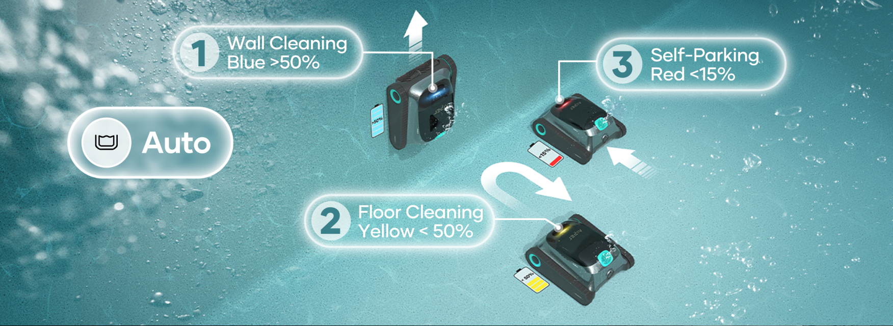 Wall Only Mode: In Wall mode, the Aiper Scuba S1 is designed to clean the pool wall using an N-shaped route, without addressing the floor. When the battery level drops, the device will automatically stop cleaning and dock itself.