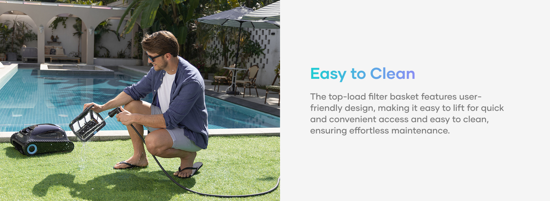 Easy-to-Clean Basket: Simply rinse out the easy-to-clean basket with a hose to ensure thorough debris removal, keeping your pool water crystal clear and inviting. This quick and straightforward process allows for efficient maintenance and cleaning of the Aiper Scuba S1, so you’ll be able to spend more time enjoying your pool and less time on maintenance.