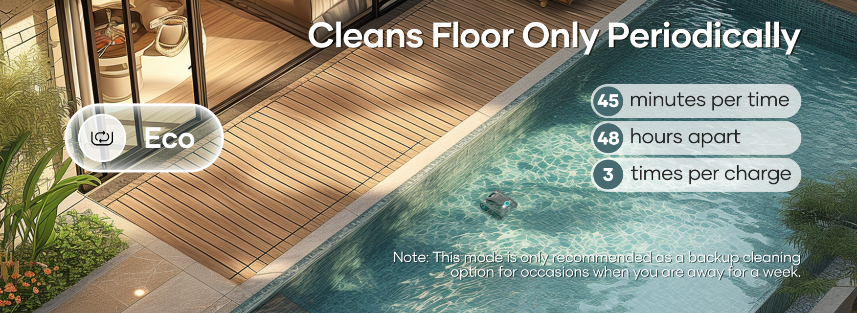 Eco Mode: In Eco Mode, the Aiper Scuba S1 cleans the pool floor for 45 minutes every 48 hours for a full week when fully charged. This efficient setting helps keep your pool clean while conserving energy.