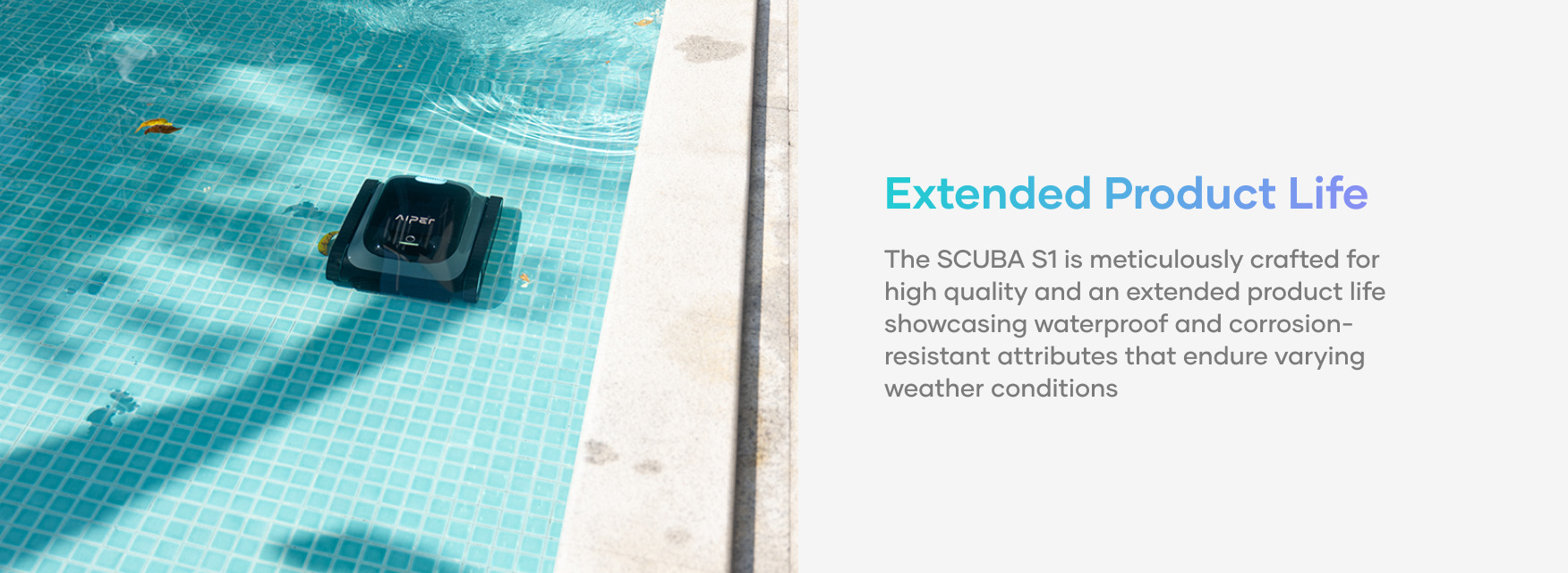 Durability: The Aiper Scuba S1 is meticulously crafted to ensure high quality and an extended product life. Its waterproof and corrosion-resistant features are designed to withstand various weather conditions, providing durability and reliability for long-term use. This thoughtful engineering ensures that your Scuba S1 remains effective and performs at its best, season after season.
